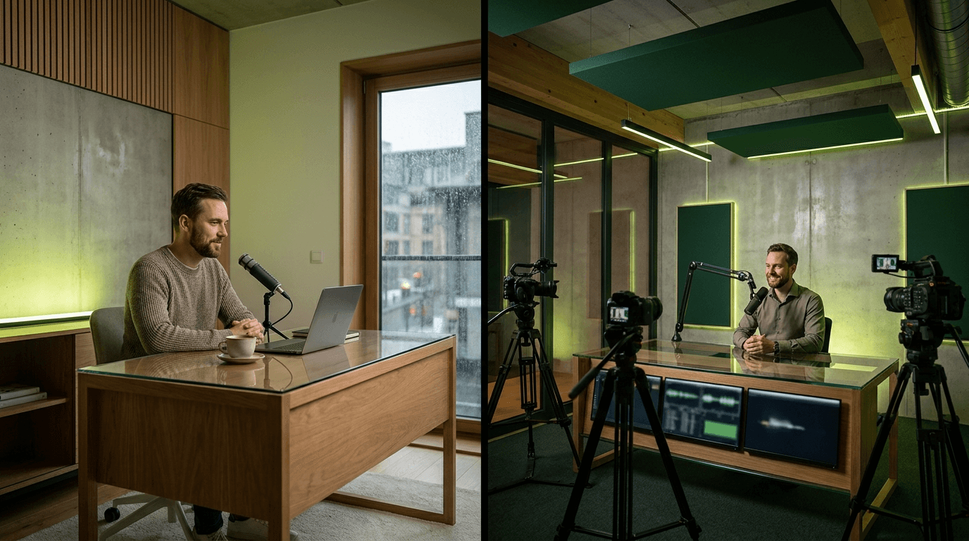 Studio pro vs setup maison : qualité, coûts cachés, temps perdu, image de marque. La comparaison honnête pour choisir où enregistrer son podcast B2B.